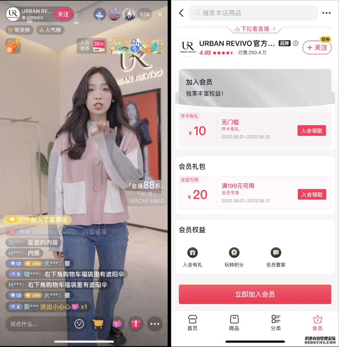 首先是入会引导。UR会通过直播间话术、店铺首页置顶、店铺精选页大图等用户入口,以入会无门槛优惠券、福利礼包等形式引导用户成为会员,入会率能达到6.6%。抖音电商官方也鼓励品牌建立直播间粉丝体系,加强观看直播到成为会员的能力建设。
