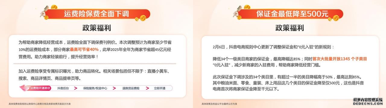 围绕运费险和保证金两大支出,抖音电商大力降低费用,助商家从容经营。本次运费险保费下调将为商家至少节省10%的运费险成本,部分商家最高可节省40%。2025年全年将为商家节省超45亿元经营费用。保证金下调力度同样吸睛。平台降低34个一级类目商家的保证金,最高降幅达85%,同时首次大批量开放1345个子类目“0元入驻”。此举让开店变得更简单,新老商家同时受益。