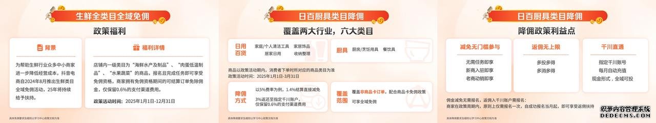 除商品卡免佣外,抖音电商商家产品运营李南为观众讲解了更多类目商品免佣细则。其中,生鲜行业自身带有经营成本高、毛利低、竞争激烈的特点。为帮助生鲜领域的中小商家降本增效,自2024年8月,抖音电商推出生鲜类目全域免佣活动,2025年将持续扶持。此外,日用百货、厨具、服配也是抖音电商中小商家聚集密度较高的类目。抖音电商通过降佣的方式扶持这些类目商家发展。值得一提的是,新商免佣政策的到来极大地提振了入驻信心,对于在3月卖出首单的新商家进行100%免佣,以现金形式返还。此项举措致力于降低入驻门槛,繁荣站内生态。