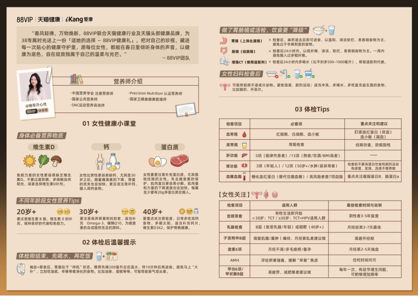 同时,拥有中国营养学会注册营养师、Precision Nutrition认证营养师、国家公共营养师等多重专业资质的营养师@锤哥开心吃 作为88VIP体验官,专为88VIP女性用户打造了一套特色体检方案和营养成分分析,进一步强化“成分为先”的专业心智。